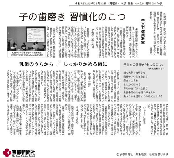 京都新聞朝刊(2025年9月22日)で「子どもの健康教室」が紹介されました